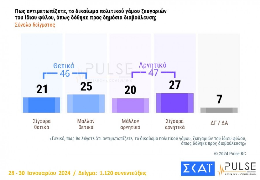 Με ξεκάθαρο τρόπο η κοινωνία τάχθηκε κατά του γάμου των ομόφυλων ζευγαριών όπως έδειξε η δημοσκόπηση της Pulse για τον ΣΚΑΪ.