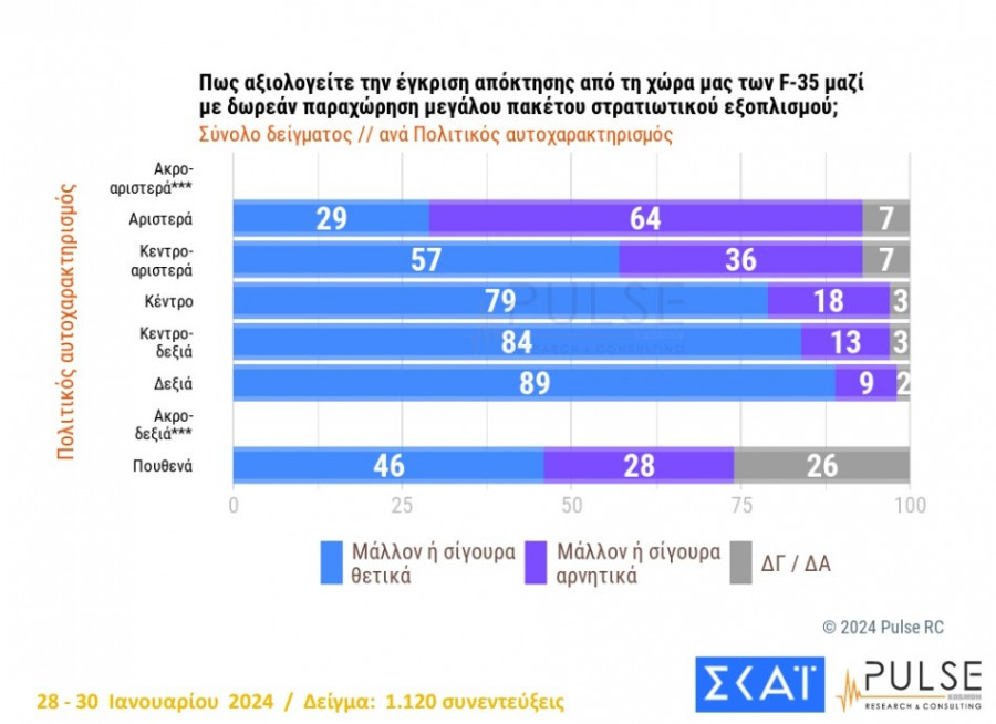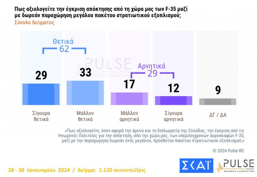 Σε δημοσκόπηση της Pulse που προβλήθηκε στο κεντρικό δελτίο του ΣΚΑΪ, καταδεικνύεται ότι δύο στους τρεις πολίτες τίθενται υπέρ της αγοράς των F-35, παρά το μεγάλο κόστος, από τη χώρας.