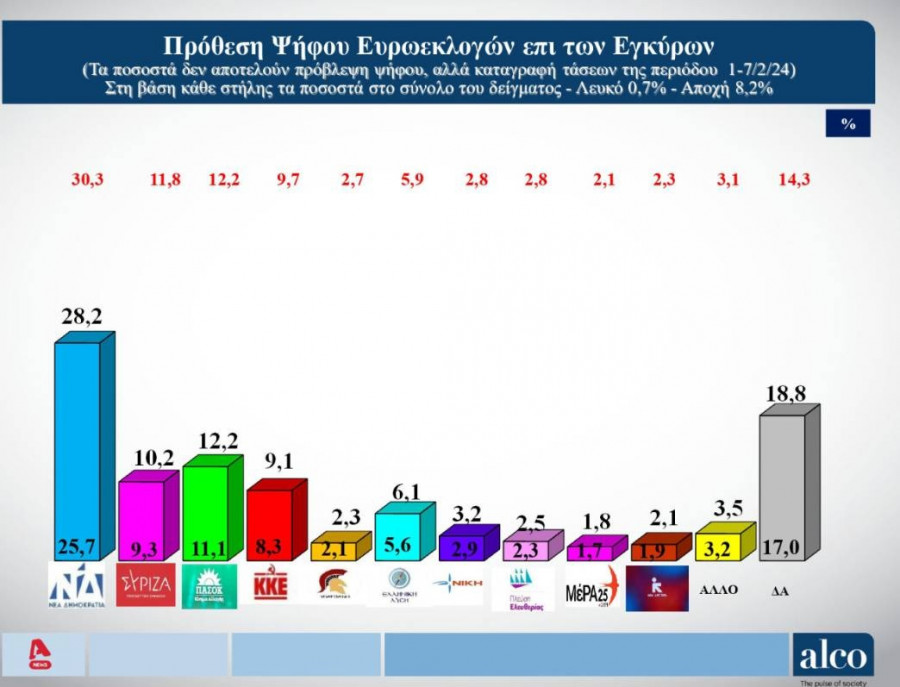 Σύμφωνα με την δημοσκόπηση της ALCO, η Νέα Δημοκρατία είναι μπροστά με 28,2%, το ΠΑΣΟΚ παραμένει στη δεύτερη θέση με 12,2% ενώ σταθερά... τρίτος ο ΣΥΡΙΖΑ του Στέφανου Κασσελάκη με 10,2%