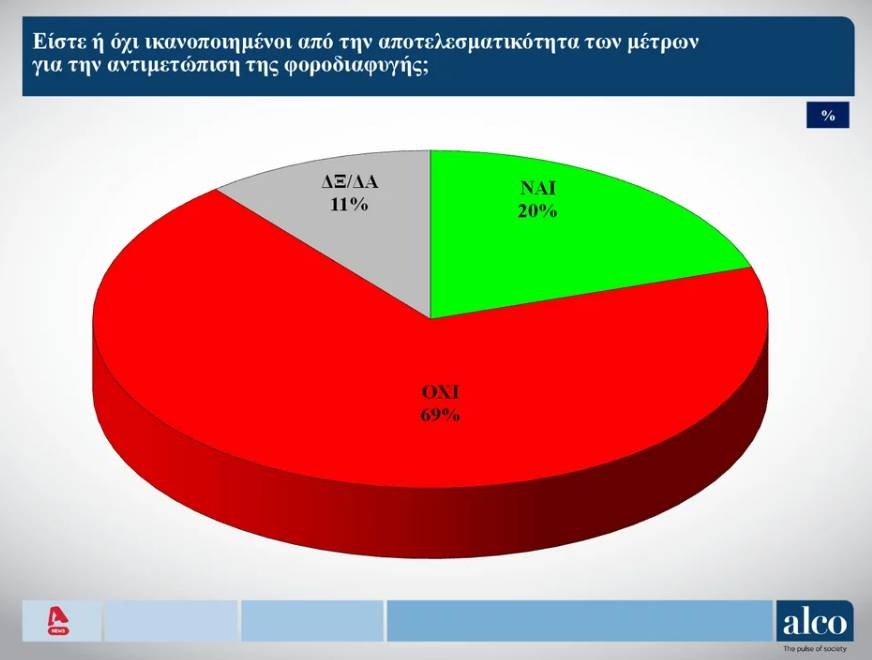 Σε ερώτημα για το αποτέλεσμα των μέτρων αντιμετώπισης της φοροδιαφυγής το 69% απαντάει αρνητικά και μόλις το 20% θετικά όπως αναφέρεται στην δημοσκόπηση της Alco που πραγματοποιήθηκε για λογαριασμό του τηλεοπτικού σταθμού Alpha.