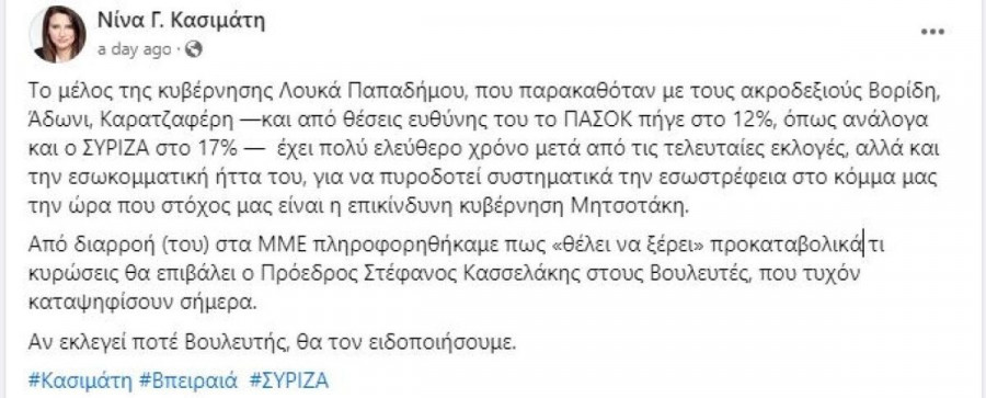 Νέο επεισόδιο στην κόντρα μεταξύ του Γιάννη Ραγκούση και της Νίνας Κασιμάτη - Η απάντηση της βουλευτή Β΄Πειραιά του ΣΥΡΙΖΑ