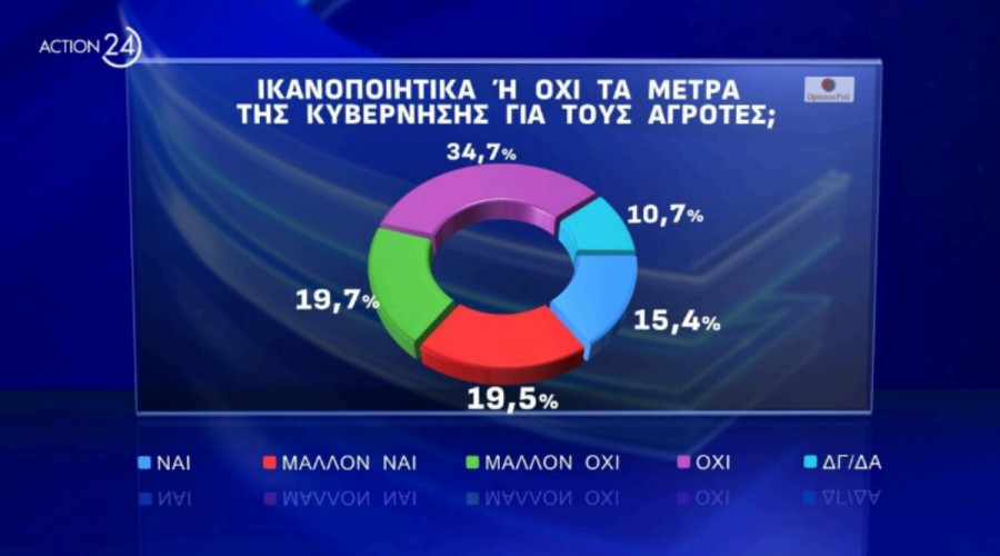 Αναφορικά με τις αγροτικές κινητοποιήσεις και τα μέτρα της κυβέρνησης, το 34,7% φαίνεται να μην είναι ικανοποιημένο. Συγκεκριμένα, στην ερώτηση «ικανοποιητικά ή όχι τα μέτρα της κυβέρνησης για τους αγρότες;», η δημοσκόπηση δίνει τα εξής αποτελέσματα: