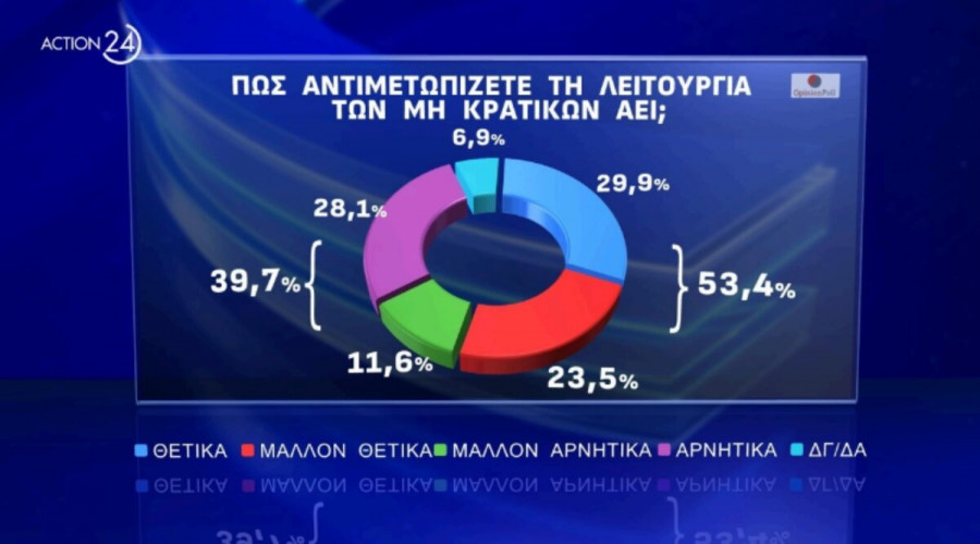 Στο ερώτημα «πώς αντιμετωπίζεται τη λειτουργία των μη κρατικών ΑΕΙ;», το 29,9% απαντά θετικά, ενώ το 28,1% αρνητικά.
