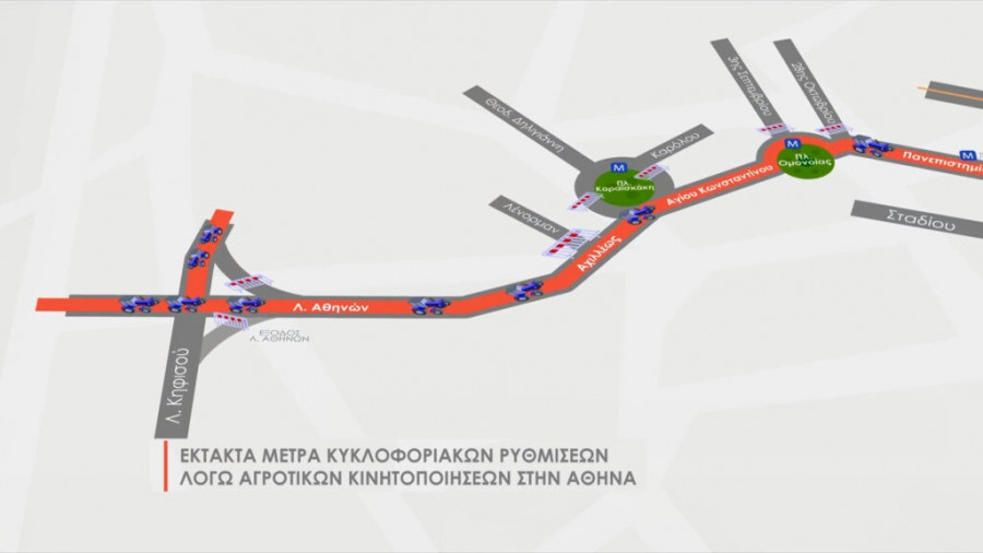 Προσωρινή διακοπή της κυκλοφορίας κατά μήκος του δρομολογίου που θα ακολουθήσουν τα αγροτικά οχήματα: Λεωφόρος Αθηνών, Αχιλλέως, πλατεία Καραϊσκάκη. Θα κινηθούν αντίθετα στην οδό Αγίου Κωνσταντίνου, την πλατεία Ομονοίας και την οδό Πανεπιστημίου, προκειμένου να φθάσουν στο Σύνταγμα. Θα υπάρξει προσωρινή διακοπή της κυκλοφορίας πέριξ της πλατείας Ομονοίας.