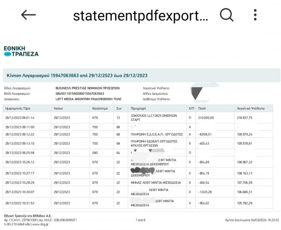 - Υποστήριξε πως το δάνειο της εταιρείας μπήκε στον λογαριασμό της Left Media AE το απόγευμα της Παρασκευής, 29/12/2023, μετά την καταβολή της μισθοδοσίας των εργαζομένων, ενώ η αλήθεια είναι (την οποία γνωρίζει άριστα) ότι 20.000€ είχαν μπει στο ταμείο στις 21/12/2023 (για την καταβολή τμήματος του Δώρου Χριστουγέννων) και 210.000€ στις 29/12/2023 και ώρα 09.01 π.μ., με την καταβολή της μισθοδοσίας στους εργαζόμενους να ξεκινά περίπου μιάμιση ώρα αργότερα (10.26 π.μ.).