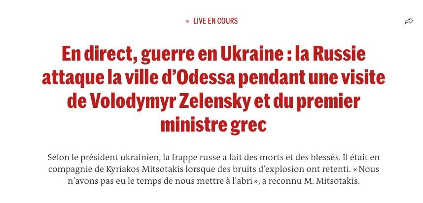 Η γαλλική Le Monde στις live εξελίξεις της για τον πόλεμο στην Ουκρανία έβαλε στον τίτλο την επίθεση στην Οδησσό.