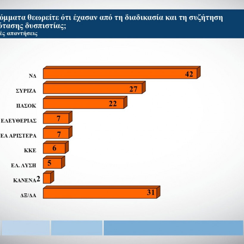 Πάντως σχεδόν 4 στους 10 θεωρούν πως η ΝΔ βγήκε χαμένη από την διαδικασία της συζήτησης και ψήφισης της πρότασης δυσπιστίας, σύμφωνα με την δημοσκόπηση της Alco για τον Alpha.