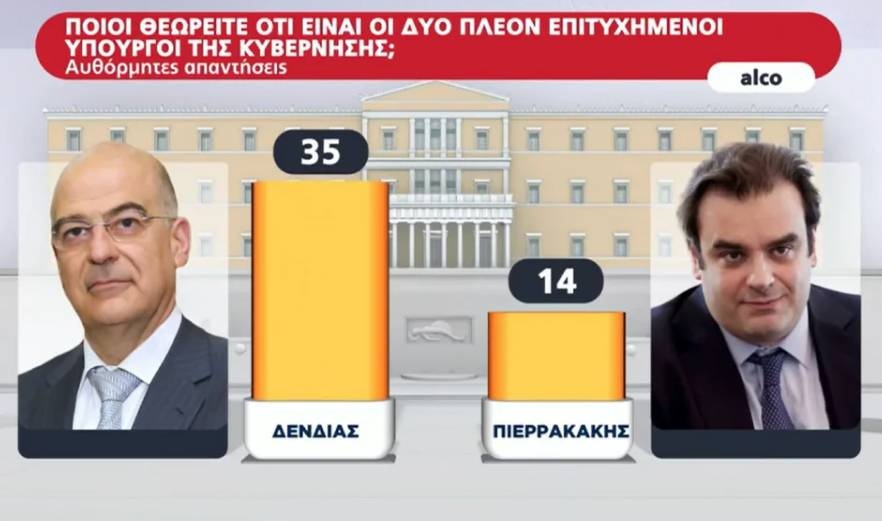 Δημοφιλέστεροι υπουργοί σύμφωνα με το δεύτερο μέρος της δημοσκόπησης της Alco είναι ο υπουργός Άμυνας Νίκος Δένδιας και ο υπουργός Παιδείας Κυριάκος Πιερρακάκης. Ακολουθούν ο Άδωνις Γεωργιάδης και ο Μάκης Βορίδης.