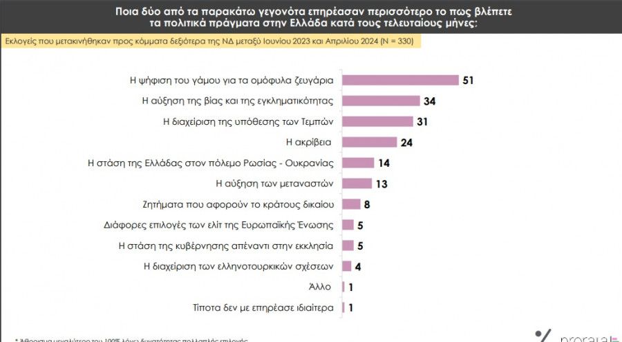 Σύμφωνα με την έρευνα, τον σημαντικότερο ρόλο στην εκλογική προτίμηση όσων μετακινήθηκαν από τον Ιούνιο του 2023 μέχρι σήμερα σε κόμμα δεξιά της Νέας Δημοκρατίας, έπαιξε «η απομάκρυνση του κόμματος από παραδοσιακές του θέσεις» (60%), ενώ οι εξελίξεις που επηρέασαν περισσότερο τους ψηφοφόρους αυτής της κατηγορίας ήταν: η ψήφιση του νόμου για τα ομόφυλα ζευγάρια (51%), η αύξηση της εγκληματικότητας (34%), η διαχείριση της υπόθεσης των Τεμπών (31%) και η ακρίβεια (24%).