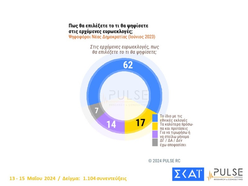 Στην ίδια ερώτηση, το 62% των ψηφοφόρων της ΝΔ (όπως αυτοί διαμορφώθηκαν στις εθνικές εκλογές το 2023), απαντά ότι θα ψηφίσει στις ευρωεκλογές το ίδιο με τις εθνικές, το 17% με βάση τα καλύτερα πρόσωπα και τις καλύτερες προτάσεις και το 14% για να τιμωρήσει ή να στείλει ένα μήνυμα.