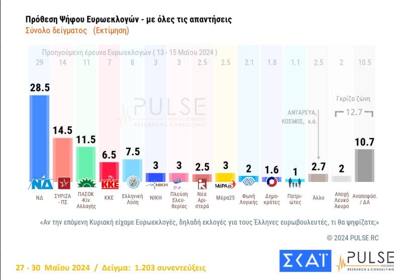 Στο 28.5 το προβάδισμα της Νέας Δημοκρατίας στην πρόθεση ψήφου σύμφωνα με τη δημοσκόπηση της PULSE