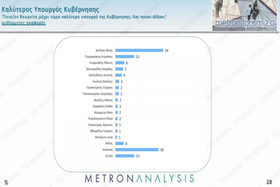 Στο ερώτημα της δημοσκόπησης της Metron Analysis «ποια/ποιον θεωρείτε μέχρι τώρα καλύτερο υπουργό της κυβέρνησης; Και ποιον άλλο», ο Νίκος Δένδιας συγκεντρώνει 34% και ακολουθούν ο Κυριάκος Πιερρακάκης 13%, ο Άδωνις Γεωργιάδης 6%, Μιχάλης Χρυσοχοϊδης 5%, ο Κωστής Χατζηδάκης με 4%.