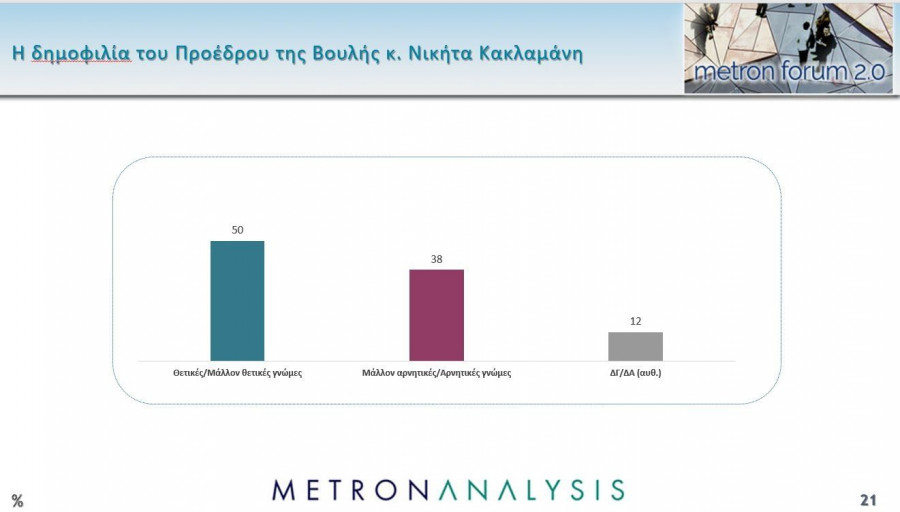 Αντιθέτως, φαίνεται ότι ο νέος Πρόεδρος της Βουλής, Νικήτας Κακλαμάνης έχει μια αρκετά θετική αποδοχή, καθώς έχει 50% θετικές γνώμες και 38% αρνητικές.
