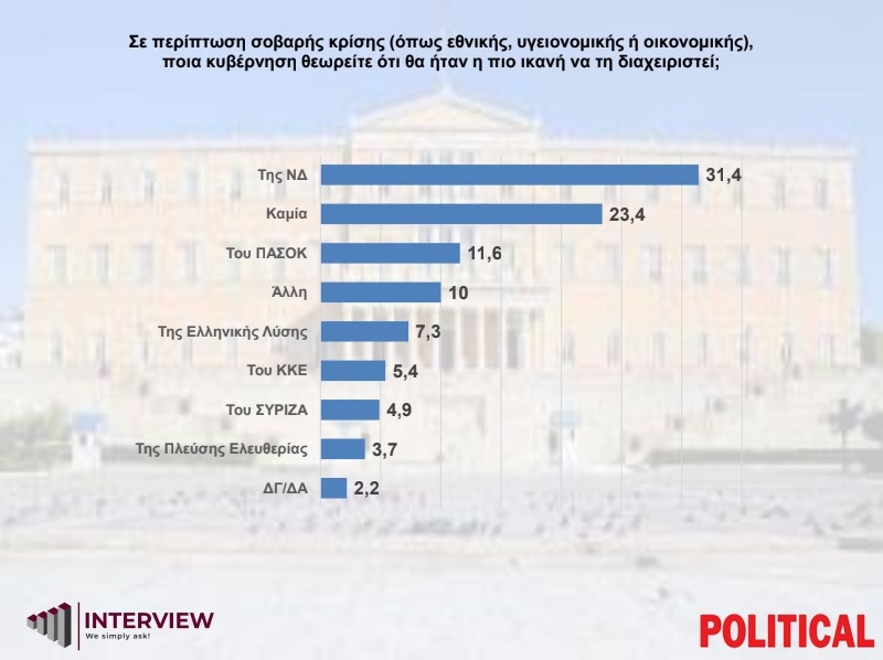 Αρκετά καλά είναι τα ευρήματα για το κυβερνών κόμμα και στο ερώτημα για το ποια κυβέρνηση θεωρούν οι πολίτες ότι θα ήταν η πιο ικανή να διαχειριστεί μια περίπτωση σοβαρής κρίσης (όπως εθνικής, υγειονομικής ή οικονομικής). Οι ερωτηθέντες, σε ποσοστό 31,4% επιλέγουν τη Νέα Δημοκρατία, καμία το 23,4%, το ΠΑΣΟΚ το 11,6%, άλλη το 10%, την Ελληνική Λύση το 7,3, το ΚΚΕ το 5,4%, τον ΣΥΡΙΖΑ το 4,9%, την Πλεύση Ελευθερίας το 3,7%, ενώ στο δεν γνωρίζω/δεν απαντώ τοποθετείται το 2,2%.