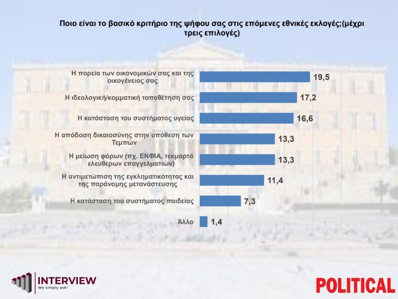 Στο ερώτημα ποιο είναι το βασικό κριτήριο της ψήφου τους στις επόμενες εθνικές εκλογές, οι ερωτηθέντες σε ποσοστό 19,5% απαντούν πως είναι η πορεία των οικονομικών τους και της οικογένειάς τους, το 17,2% πως είναι η ιδεολογική και κομματική τους τοποθέτηση, το 16,6% η κατάσταση του συστήματος Υγείας, το 13,3% η απόδοση δικαιοσύνης στην υπόθεση των Τεμπών, το 11,4% η αντιμετώπιση της εγκληματικότητας και της παράνομης μετανάστευσης και το 7,4% η κατάσταση του συστήματος Παιδείας. Άλλο, απαντά το 1,4%.