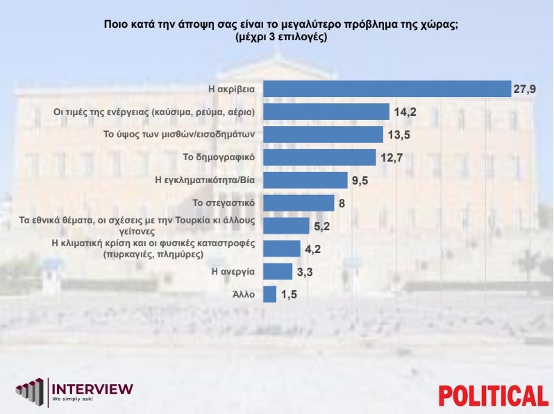 Η ακρίβεια αναδεικνύεται ως το μεγαλύτερο πρόβλημα της χώρας στα μάτια των πολιτών, σύμφωνα με την πανελλαδική σφυγμομέτρηση για την political της εταιρείας Interview – Η ΝΔ προηγείται με ποσοστό 24,7% στην πρόθεση ψήφου. Επιστρέφει το ΠΑΣΟΚ στην δεύτερη θέση – Στην τέταρτη θέση το κόμμα της Ζωής Κωνσταντοπούλου