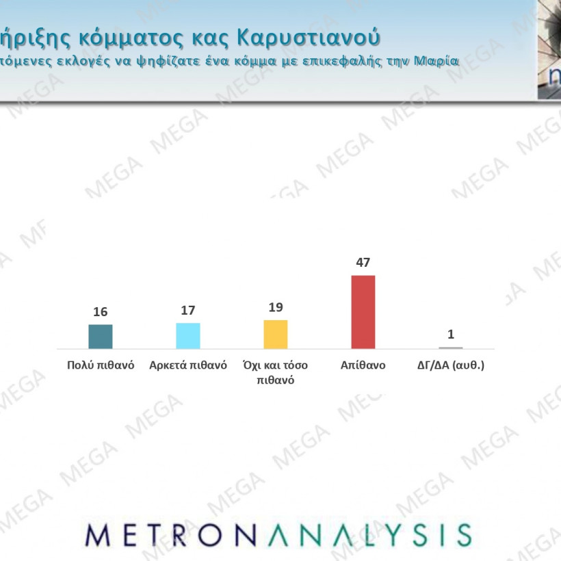 Παράλληλα, άνοδο δύο μονάδων –από το 14% στο 16%– σε σύγκριση με τον Δεκέμβριο εμφανίζουν εκείνοι που δηλώνουν ότι είναι πολύ πιθανό να ψηφίσουν ένα κόμμα με επικεφαλής την κυρία Καρυστιανού.