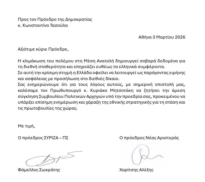 Στις επιστολές τους προς τον πρωθυπουργό και τον ΠτΔ, οι πρόεδροι των δύο κομμάτων τονίζουν: «Η κλιμάκωση του πολέμου στη Μέση Ανατολή δημιουργεί σοβαρά δεδομένα για τη διεθνή σταθερότητα και επηρεάζει ευθέως τα ελληνικά συμφέροντα. Σε αυτή την κρίσιμη στιγμή, η Ελλάδα οφείλει να λειτουργεί ως παράγοντας ειρήνης και ασφάλειας με προσήλωση στο διεθνές δίκαιο».