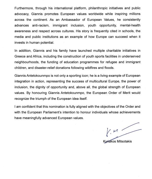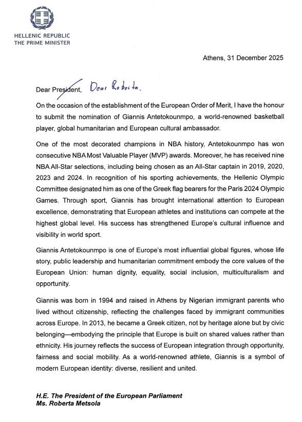 «Ο Γιάννης Αντετοκούνμπο είναι μια από τις πιο επιδραστικές παγκόσμιες προσωπικότητες της Ευρώπης, του οποίου η ιστορία ζωής, η δημόσια ηγεσία και η δέσμευση στα ανθρωπιστικά ιδεώδη ενσαρκώνουν τις βασικές αξίες της Ευρωπαϊκής Ένωσης: την ανθρώπινη αξιοπρέπεια, την ισότητα, την κοινωνική ένταξη, την πολυπολιτισμικότητα και τις ευκαιρίες», σημειώνει χαρακτηριστικά στην επιστολή του προς την κυρία Μετσόλα, ο κ. Μητσοτάκης.