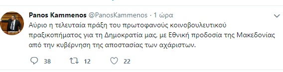 Μερικές ώρες πριν πάει για ψήφιση στην ολομέλεια της Βουλής η επικύρωση της ένταξης των Σκοπίων στο ΝΑΤΟ και εφόσον είχε προηγηθεί η γνωμοδότηση του Επιστημονικού Συμβουλίου της Βουλής με βάση την οποία αν αποχωρήσει από τους ΑΝΕΛ ο Θανάσης Παπαχριστόπουλος το κόμμα μένει χωρίς κοινοβουλευτική ομάδα, ο Πάνος Καμμένος με μια ανάρτηση του στο twitter βάλει εναντίον του ΣΥΡΙΖΑ και του προέδρου της Βουλής.