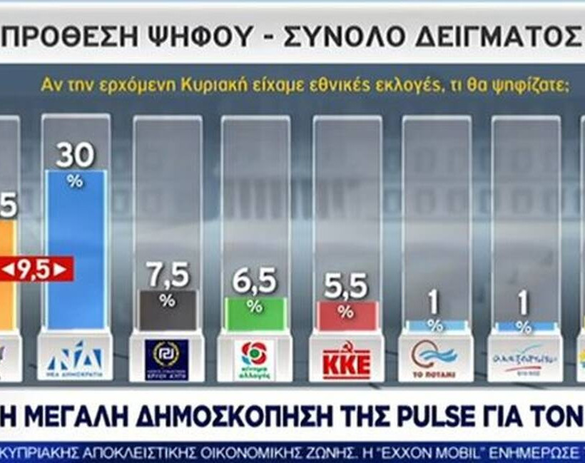 Προβάδισμα 9,5 μονάδων στη ΝΔ δείχνουν τα στοιχεία της δημοσκόπησης της Pulse που διενεργήθηκε για λογαριασμό του ΣΚΑΪ το διάστημα 24-26 Φεβρουαρίου 2019 σε πανελλαδικό δείγμα 1.323 ενηλίκων.