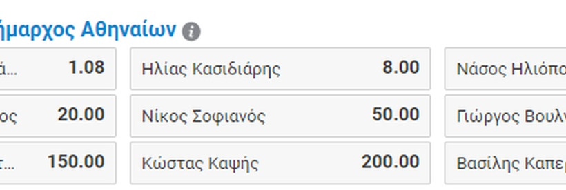 Στη διεκδίκηση του δήμου Αθηναίων οι στοιχηματικές εταιρείες δείχνουν φαβορί τον Κώστα Μπακογιάννη με απόδοση 1,08 Πηγή: Πηγή: Stoiximan.gr