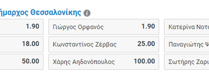 Δείτε παρακάτω στην gallary του Newsbomb.gr τις αποδόσεις των στοιχήματων για τους μεγαλύτερους Δήμους και Περιφέρειες