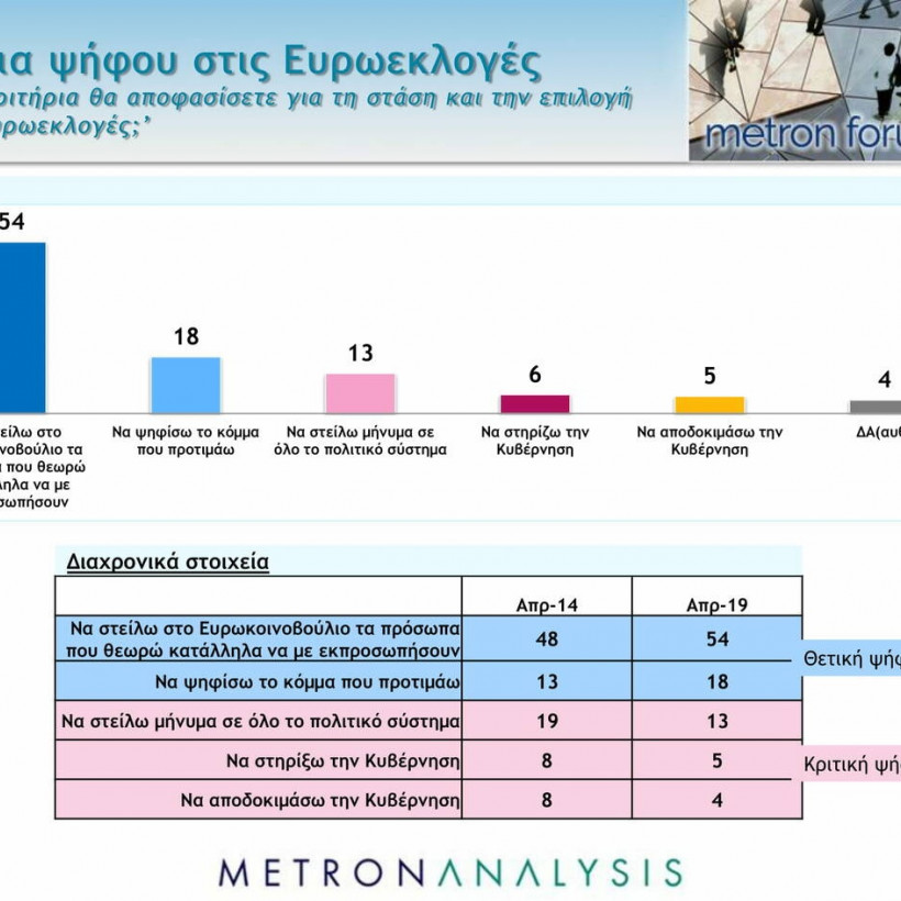 Για τις ευρωεκλογές η Νέα Δημοκρατία φαίνεται να είναι πρώτο κόμμα με 27,2% και να ακολουθείται από τον ΣΥΡΙΖΑ με 19,9%. Το ΚΙΝΑΛ βρίσκεται στην τρίτη θέση με 6,6%,ακολουθεί το ΚΚΕ με 5,8% και η Χρυσή Αυγή με 4,6%. Η αδιευκρίνιστη ψήφος φτάνει το 13,3%.