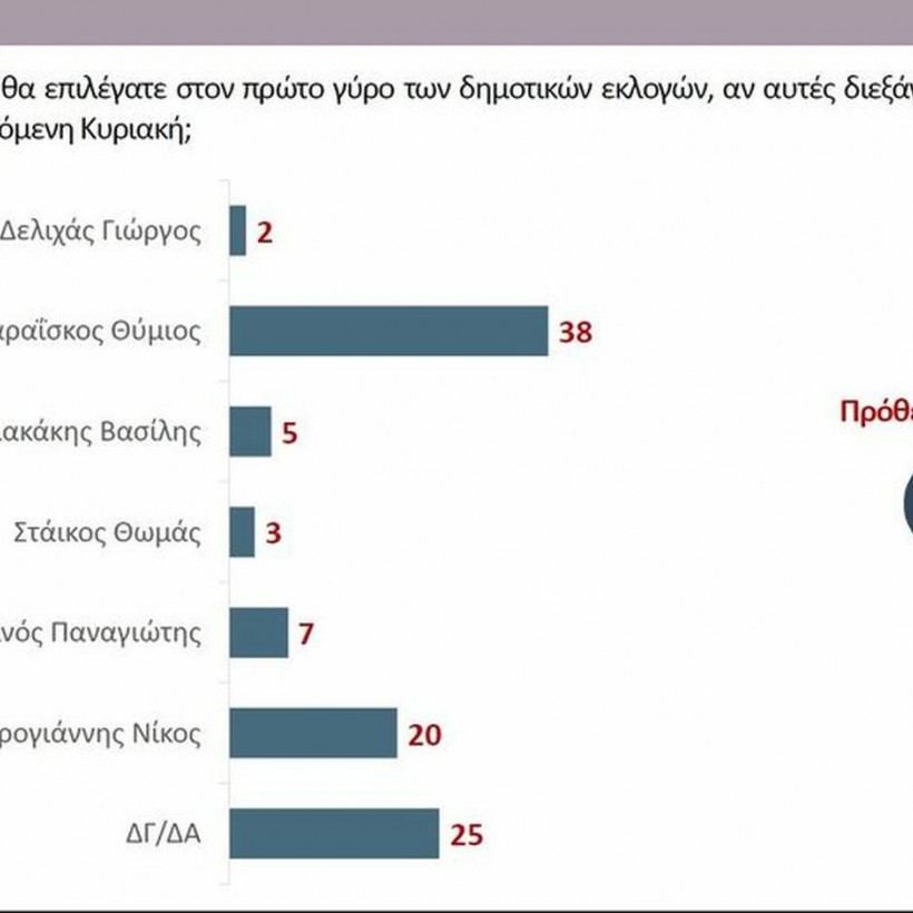 Πιο συγκεκριμένα ο Θύμιος Καραΐσκος συγκεντρώνει ποσοστό 38%, έναντι του Νίκου Σταυρογιάννη που έχει ποσοστό 20%.