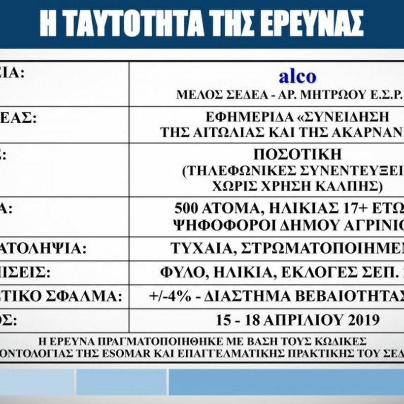Δημοτικές εκλογές 2019: Νέα μεγάλη δημοσκόπηση για τις εκλογές στο Δήμο Αγρινίου, φέρνει στη δημοσιότητα η εφημερίδα «Συνείδηση» σε συνεργασία με την εταιρεία δημοσκοπήσεων «Alco».