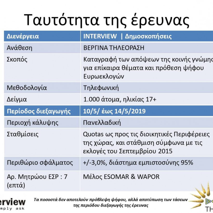 Στις 8,8 μονάδες καταγράφει την διαφορά μεταξύ Νέας Δημοκρατίας και ΣΥΡΙΖΑ δημοσκόπηση της interview η οποία διενεργήθηκε για την Βεργίνα Τηλεόραση.