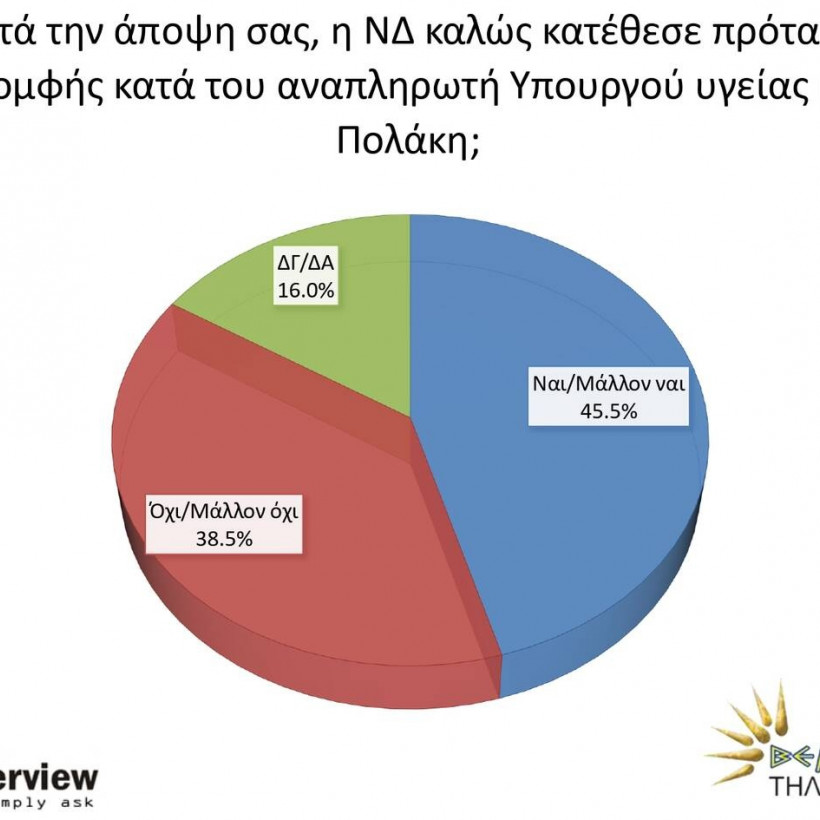 Το 45,5% συμφωνεί με την πρόταση μομφής κατά του Παύλου Πολάκη από τη Νέα Δημοκρατία έναντι του 38,5% που διαφωνεί.