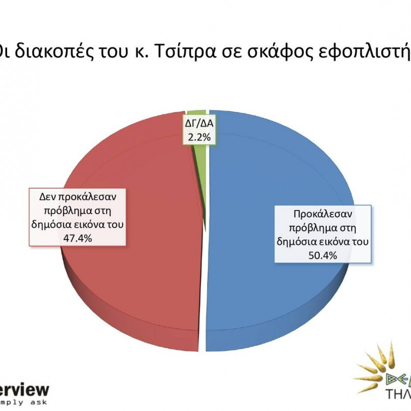 Όσον αφορά τις διακοπές του πρωθυπουργού Αλέξη Τσίπρα σε σκάφος, το 50,4% εκτιμά πως προκάλεσαν πρόβλημα στην δημόσια εικόνα του. Αντίθετη άποψη έχει το 47,4% των ερωτηθέντων.