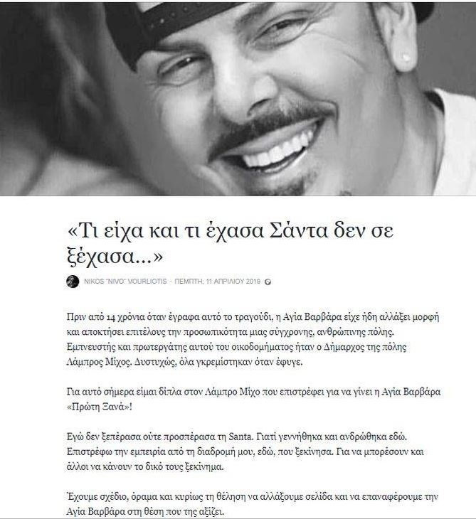 Ο NiVo με καταγωγή από την Αγία Βαρβάρα, αποδέχτηκε την πρόσκληση του πρώην Δημάρχου Αγίας Βαρβάρας και εκ νέου υποψήφιου δήμαρχου, κ. Λάμπρου Μίχου, να συμμετέχει στις εκλογές.