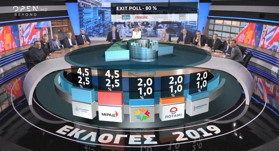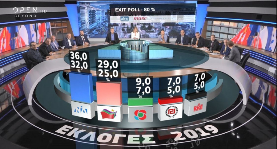 Mε βάση το - κοινό - exit poll 2019 των καναλιών ALPHA (METRON Analysis), ANT1 (MARC), Open Beyond (ALCO), STAR (MRB) και ΣΚΑΪ (Pulse) τα αποτελέσματα στις Ευρωεκλογές 2019 διαμορφώνονται ως εξής: