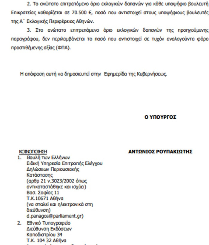 Εγκύκλιο σχετική με το ανώτατο επιτρεπόμενο όριο εκλογικών δαπανών για κάθε υποψήφιο βουλευτή δημοσιοποίησε το Υπουργείο Εσωτερικών. Το ύψος της επιτρεπόμενης δαπάνης συνδέεται άρρηκτα με τον αριθμό βουλευτών που εκλέγονται σε κάθε εκλογική περιφέρεια και όσο αυξάνεται ο αριθμός, τόσο αυξάνεται και το επιτρεπόμενο όριο δαπανών.