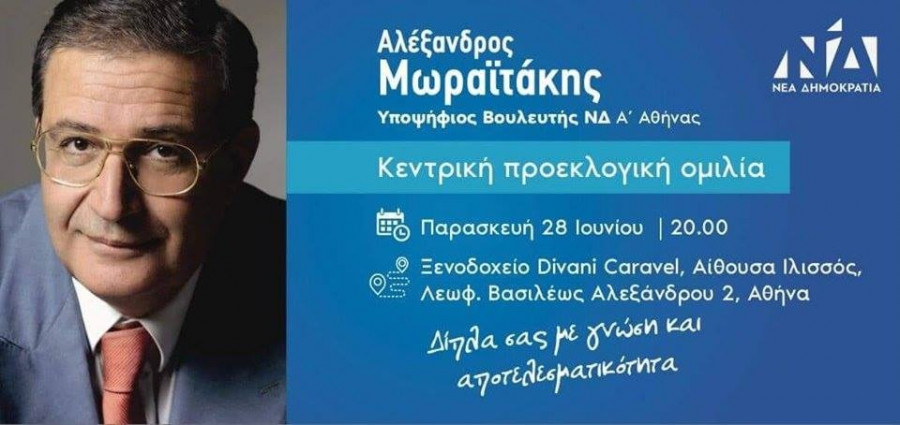 Ο Αλέξανδρος Μωραϊτάκης ενισχύει την πολιτική μάχη του Κυριάκου Μητσοτάκη και της Νέας Δημοκρατίας, ως μια επιλογή αξιοπρέπειας στην Α’ Αθηνών, στις πρόωρες εκλογές της 7ης Ιουλίου - Με κεντρικό σύνθημα «Δίπλα σας με γνώση και αποτελεσματικότητα», καλεί φίλους και συνοδοιπόρους στην Κεντρική του Ομιλία στο Divani Caravel την Παρασκευή 28 Ιουνίου 2019 στις 20:00