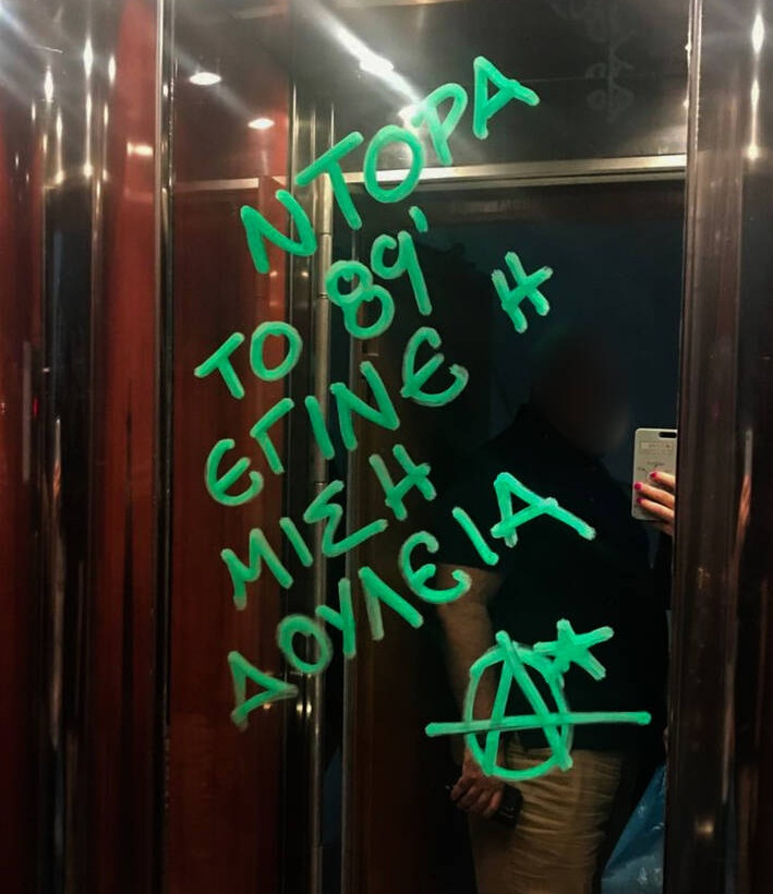 Αναφερόμενη σε ένα από τα μηνύματα που εγράφησαν στον καθρέπτη του ασανσέρ «Το ’89 έγινε μισή δουλειά» η κα Μπακογιάννη τόνισε πως «εγώ δεν φοβήθηκα τα πρωτότυπα, δεν θα φοβηθώ τα αντίγραφα… Είναι βαθιά νυχτωμένοι αν πιστεύουν πως εγώ θα σταματήσω την πολιτική μου δραστηριότητα, γιατί ζωγράφισαν στον καθρέπτη απειλές».
