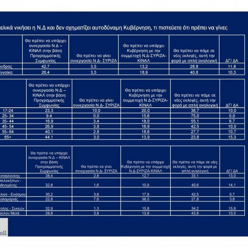Η Ν.Δ καταγράφει 32.1% έναντι 30.63% που είχε πάρει στις Ευρωεκλογές, ενώ ο ΣΥΡΙΖΑ σημειώνει μικρή κάμψη με 21% έναντι 21.7%. Το ΚΙΝ.ΑΛ. δείχνει να αυξάνει τις δυνάμεις του συγκεντρώνοντας 6.7% ( 5.77% στις Ευρωεκλογές). Η Χρυσή Αυγή σημειώνει σημαντική πτώση με 2.8% έναντι 5.81% που είχε, ενώ το Κ.Κ.Ε σημειώνει πτώση αφού συγκεντρώνει 4.4% ( 5.27% στις Ευρωεκλογές). Από τα υπόλοιπα μικρά κόμματα οριακή πτώση δείχνει η ΕΛΛΗΝΙΚΗ ΛΥΣΗ με 5.4% από 5.76% και η ΠΛΕΥΣΗ ΕΛΕΥΘΕΡΙΑΣ με 1.4% από 2.01%. Αντίθετα αύξηση εμφανίζει η ΜΕΡΑ 25 με 4.1% ( 4% στις Ευρωεκλογές ) , όπως και η Ένωση Κεντρώων με 2.8% ( είχε 2.33% ).