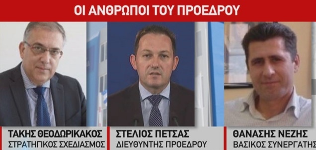 Ο Τάκης Θεοδωρικάκος είναι υπεύθυνος για τη στρατηγική, ο Στέλιος Πέτσας, διευθυντής του γραφείου του και ο Θανάσης Νέζης, βασικός συνεργάτης και ίσως ο παλιότερος.