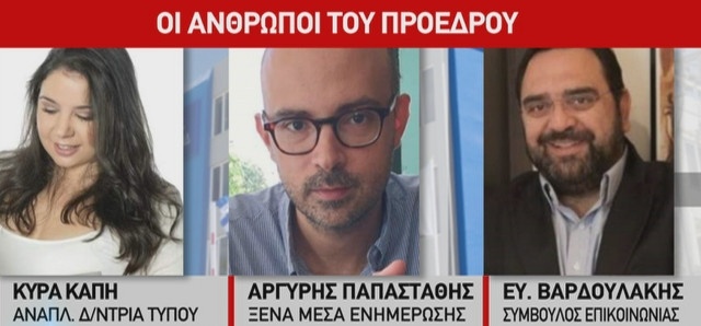 Στην επικοινωνιακή ομάδα σημαντικούς ρόλους κατέχουν: Η Κύρα Κάπη αναπληρώτρια διευθύντρια του Γραφείου Τύπου, ο δημοσιογράφος Αργύρης Παπαστάθης, αρμόδιος για τα ξένα ΜΜΕ και ο σύμβουλος επικοινωνίας Ευτύχης Βαρδουλάκης.