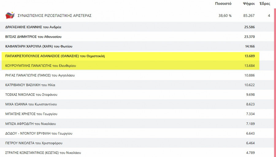 Ειδικότερα, στο Β2 Δυτικό Τομέα Αττικής ο ΣΥΡΙΖΑ εξέλεξε τέσσερις βουλευτές, με τον κ. Κουρουμπλή να μένει πέμπτος πίσω από τους Γιάννη Δραγασάκη, Δημήτρη Βίτσα, Χαρά Καφαντάρη και Θανάση Παπαχριστόπουλο.