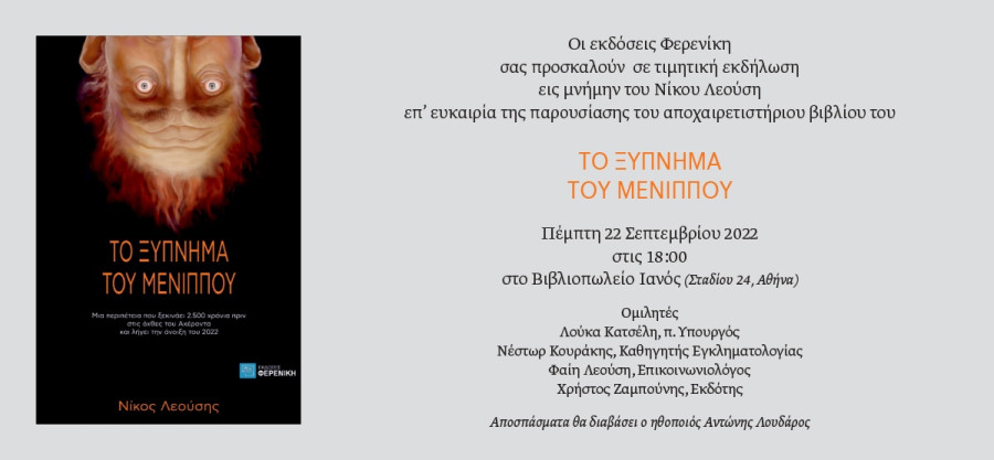 Την Πέμπτη 22 Σεπτεμβρίου στις 18:00 η Αλυσίδα Πολιτισμού IANOS και οι Εκδόσεις Φερενίκη διοργανώνουν τιμητική εκδήλωση εις μνήμην του Nίκου Λεούση επ' ευκαιρία της παρουσίασης του αποχαιρετιστήριου βιβλίου του με τίτλο «Το ξύπνημα του Μένιππου».