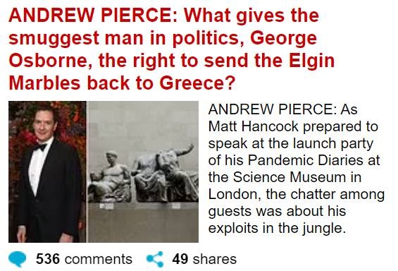 Σύμφωνα πάντως με την Daily Mail, για τον Όσμπορν το πιο σημαντικό αυτήν τη στιγμή φαίνεται να είναι ότι θα μπορούσε να γίνει αυτός που επιστρέφει τα μάρμαρα στην Ελλάδα επιλύοντας μια... πολιτιστική διαμάχη 200 ετών γεγονός πουν θα του έδινε το εφαλτήριο για έναν ρόλο στην διεθνή πολιτική σκηνή όπως να γίνει διευθύνων σύμβουλος του Διεθνούς Νομισματικού Ταμείου ή ο πρόεδρος της Παγκόσμιας Τράπεζας στην Ουάσιγκτον.