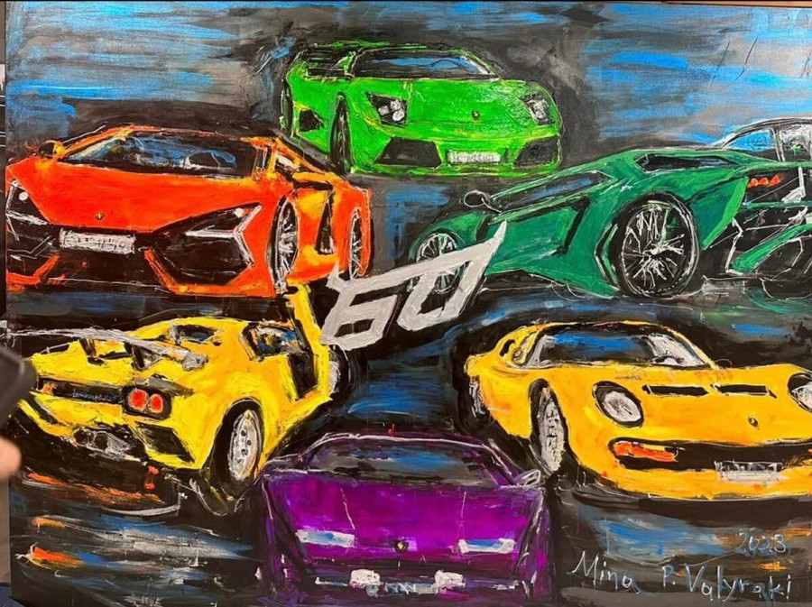 Εντυπωσιακό είναι το αποτέλεσμα της νέας δημιουργίας της ζωγράφου Μίνας Παπαθεοδώρου Βαλυράκη, με αφορμή τη συμπλήρωση 60 χρόνων από την ίδρυση της Ιταλικής αυτοκινητοβιομηχανίας Lamborghini.