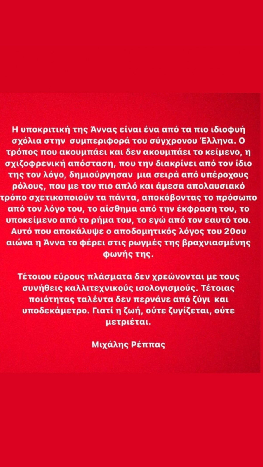 Ο Μιχάλης Ρέππας, ο οποίος συνεργάστηκε με την Άννα Παναγιωτοπούλου τόσο στην επιτυχημένη σειρά «Οι Τρεις Χάριτες» αλλά και στις κινηματογραφικές επιτυχίες «Safe Sex» και «Το Κλάμα Βγήκε Από Τον Παράδεισο» αποχαιρέτησε με ένα ιδιαίτερο, προσωπικό μήνυμα την ηθοποιό.