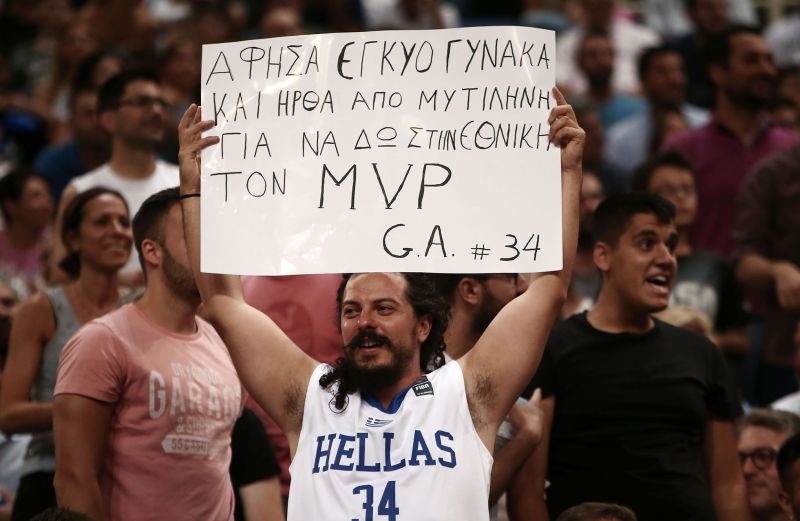 Φορώντας τη φανέλα της Ελλάδας με τον αριθμό «34» του Greek Freak ο τρελαμένος με την παρουσία του Αντετοκούνμπο φίλαθλος έγραψε στο πλακάτ: