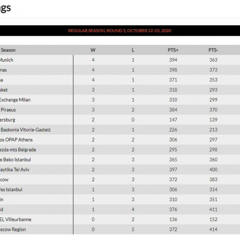 Μετά από πέντε αγωνιστικές, ισοβαθμούν με ρεκόρ 4-1 Μπάγερν, Ζαλγκίρις και Μπαρτσελόνα ενώ ακολουθούν Βαλένθια και Μιλάνο με 3-1. Αξίζει, βέβαια, να σημειωθεί πως στη φετινή Euroleague εκκρεμούν ακόμα αρκετά παιχνίδια, λόγω των αναβολών που έχουν προκληθεί μετά από κρούσματα κορονοϊούσε ομάδες.