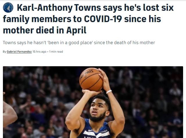 «Έχω περάσει πολλά, προφανώς με χειρότερο ό,τι έγινε με τη μητέρα μου. Δεν βρέθηκα σε “καλό μέρος” όλο αυτόν τον καιρό. Χθες βράδυ δέχτηκα ένα τηλεφώνημα και με ενημέρωσαν πως έχασα τον θείο μου», τόνισε ο Τάουνς στο ESPN, για να συνεχίσει: «Νιώθω σαν να με έχει «χτυπήσει» η ζωή. Είδα πολλά φέρετρα τους τελευταίους επτά μήνες. Είχα πολλούς ανθρώπους, συγγενείς της οικογένειας μου ή της μητέρας μου που νόσησαν από τον κορονοϊό.