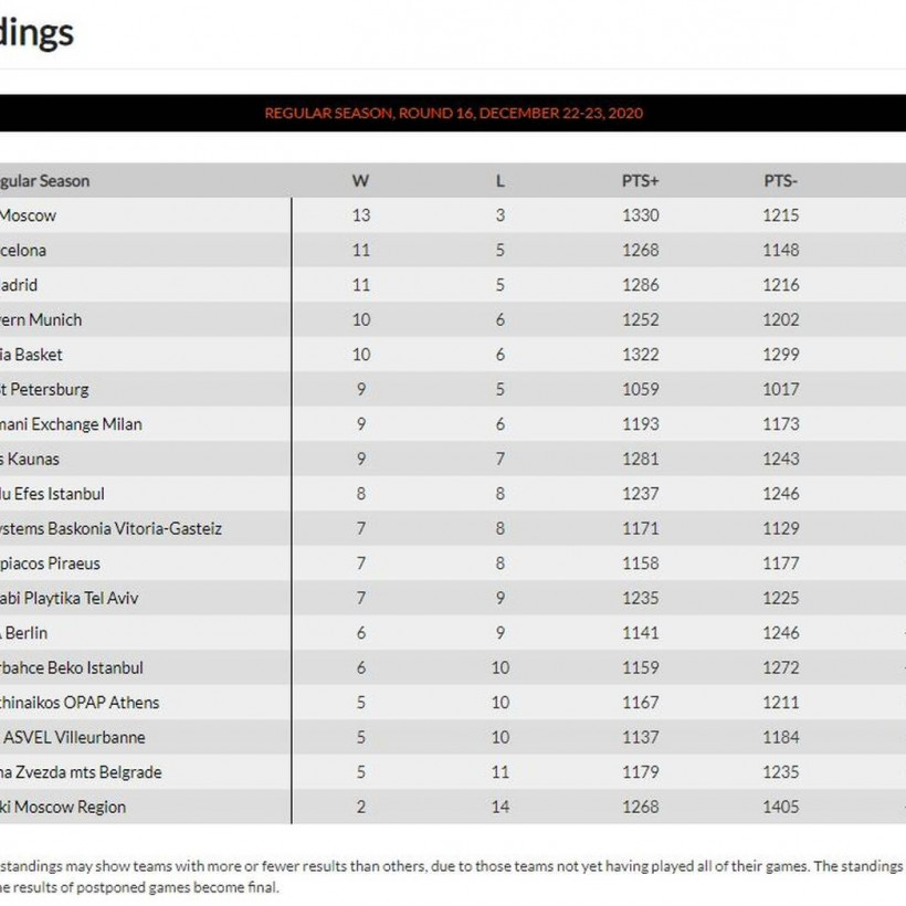Η ΤΣΣΚΑ Μόσχας παραμένει στην κορυφή με ρεκόρ 13-3 μετά από 16 αγωνιστικές, ενώ την ακολουθούν στο 11-5 Μπαρτσελόνα και Ρεάλ Μαδρίτης. Μπάγερν και Βαλένθια είναι στο 10-6 ενώ η Ζενίτ στο 9-5 και η Αρμάνι στο 9-6. Την οκτάδα συμπληρώνει η Ζαλγκίρις με ρεκόρ 9-7.